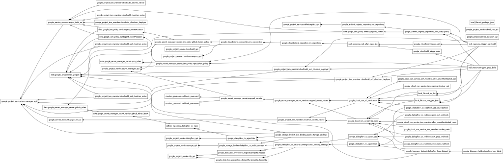 Of course, you can do this all by hand. Here’s the dependency graph from Terraform, the infrastructure-as-code (IaC) tool used in the template to scaffold the Google Cloud Platform components into service.