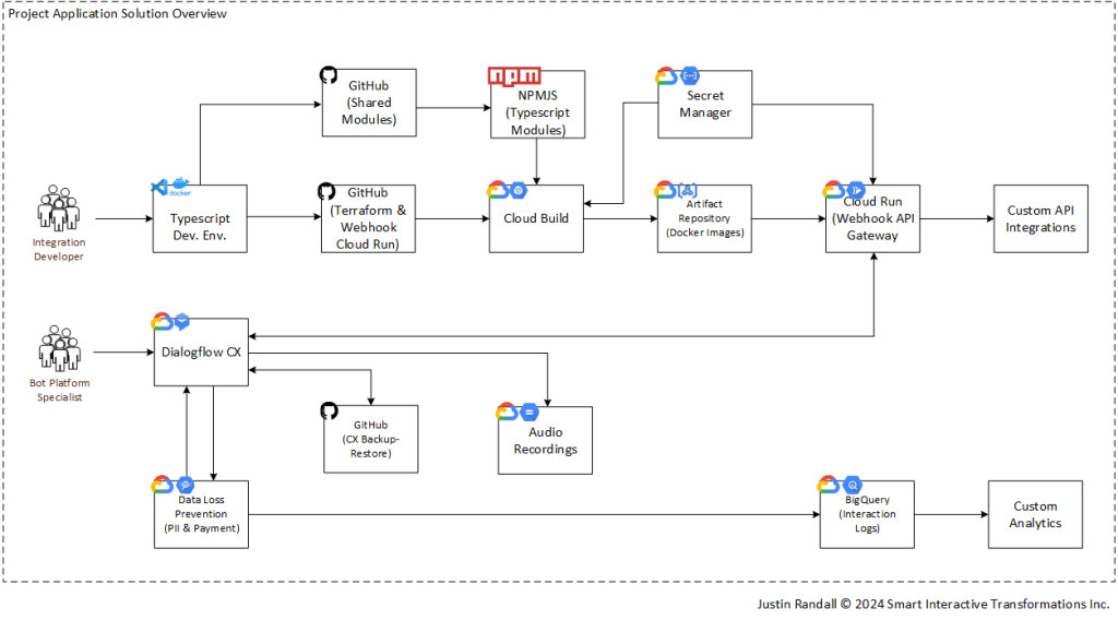 I submit to you the first of a few GitHub Dialogflow CX application project templates with infrastructure as code and implementations in various programming languages. The project deploys “prod” and “uat” (test) versions of Dialogflow CX agents, synched through GitHub branches, connected to respective “prod” and “uat” webhook API gateways running as Cloud Run services. Data loss prevention is pre-configured to redact more than 77 types of identifiable information. Audio storage for phone call interactions leverage a Cloud Storage bucket. Dedicated service accounts are used with least permissive permissions.